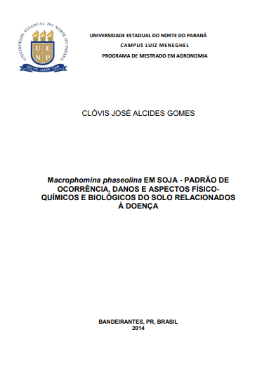 GOMES, Clovis Jose Alcides. Macrophomina phaseolina em soja - padrão de ocorrência, danos e aspectos físico-químicos e biológico do solo relacionados à doença. Orientador: João Pereira Torres. 2014. 39 f. Dissertação (Mestrado em Agronomia) – Centro de Ciências Agrárias, Campus Luiz Meneghel, Universidade Estadual do Norte do Paraná, Bandeirantes, 2014.